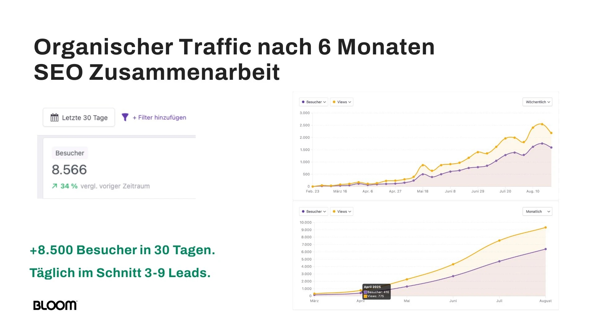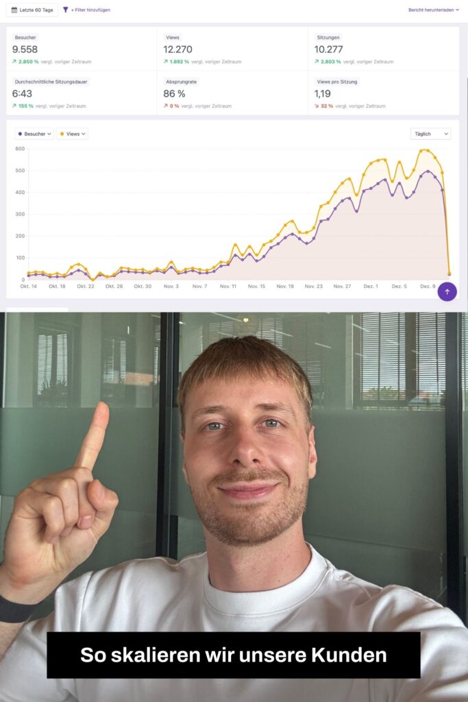 Jetzt geht es los: So haben wir unsere Kunden über SEO auf vier- bis fünf-stellige Besucherzahlen skaliert und die richtigen CTA’s an den richtigen Stellen platziert, um diese auch zur Anfrage zu bewegen. 100% done for you.
